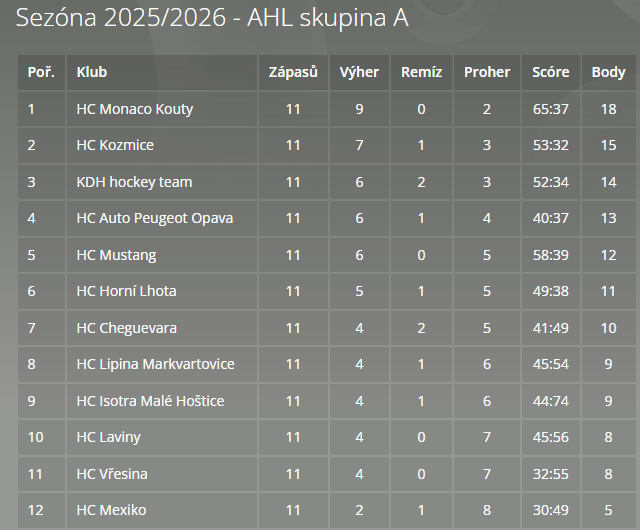 Konečná tabulka základní části amatérské hokejové ligy 2025/2026: